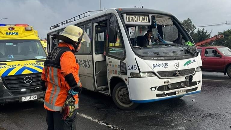 En la mañana de este lunes, pasadas las 9:00 horas, el Cuerpo de Bomberos de Temuco y varias ambulancias Samu concurrieron a un siniestro vial que se registró en el kilómetro 6 de la ruta Temuco – Labranza, en donde un microbús y un camión chocaron por alcance.